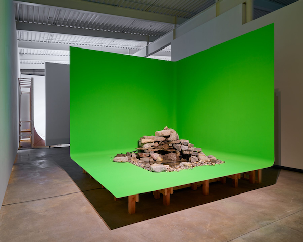Themes of the natural world extend beyond the initial monstera plants through controlled or enclosed spaces. In Zoo (2025), a surveillance-like setup of TVs displays live streams of animals in zoos or natural pastures, offering another staged space within the exhibition. In the adjacent room, LOOP (2023/25) is a more conventional fountain in which water slowly and meditatively moves through a rocky structure that is staged for observation against a constructed chroma-key green stage. This backdrop completely offsets our expectations of an outside world that might accompany a natural fountain. Instead, it feels like a call to continue the work within our imagination.