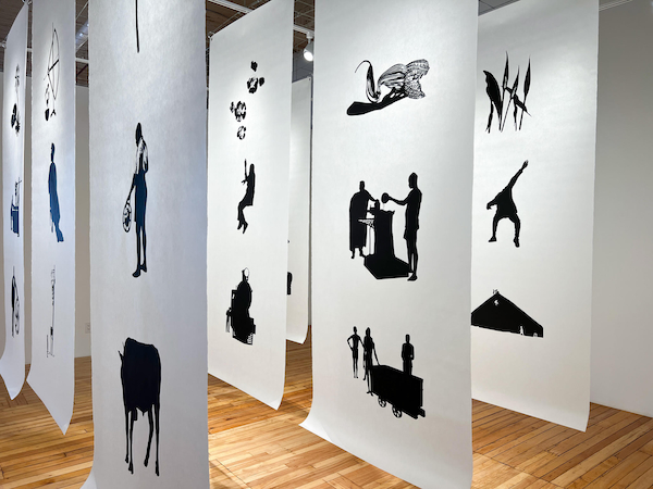 Each towering span of Japanese paper bears three deftly balanced black ink silhouettes, neatly spaced like the lines of a poem. While many are solid forms that evoke the heft of Kara Walker’s well-known silhouettes of antebellum slavery and its many violences, other icons among this company are punctuated with the fine organic tracery of delicately veined leaves and seed pods. These float above it all, free of history’s weight.