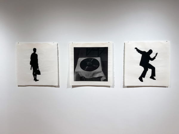 A photographically detailed image of a record at rest on a cloth-covered table seen from above in a shadowed interior is displayed on the wall nearby. This scene anchors yet another triad, being flanked by two prints of silhouetted figures – one stands still, burdened by baggage; the other is explosive with dance. The pause lingers longest here, at this bridge between a heavy past and a future capable of joy.