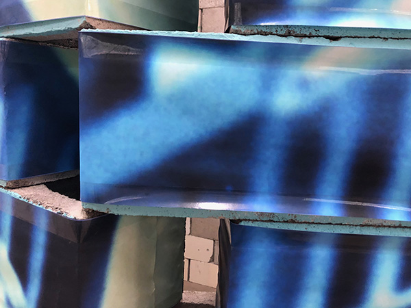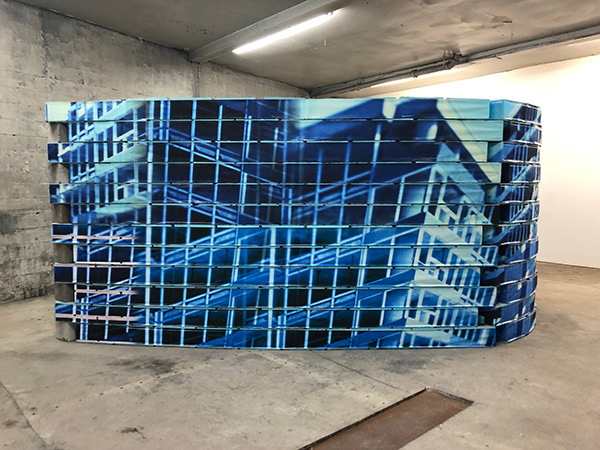 Condo 88.9 is a photo-sculpture that “revisits and updates a significant work from Belcher’s Condominium series” initially created in 1987/88 and shown in New York, Los Angeles, and Geneva. A pointed comment on “the generational and spatial reproduction of free market urbanism,” it is constructed from 348 cinderblocks forming a tightly contained oblong architectural space that you cannot enter but can see inside through gaps in the block on block construction. The sculptural front is assembled from a large colour mural photograph, sliced along lines defined by the cinderblocks, “laminated” with scotch tape, and hot glued in place. The photo is highly saturated, mostly monochromatic blue. Originally shot on film, the artist projects and rephotographs it “to exaggerate perspective and induce vertigo.”