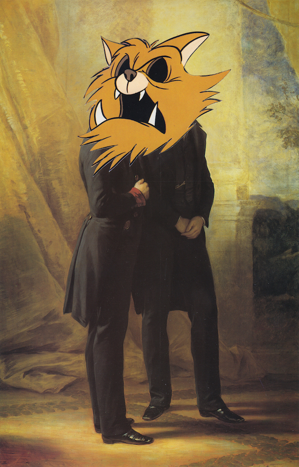 Henderson has a graphic designer’s sense of form and composition that he combines with wickedly playful and slyly mischievous imagery. His collages wander through a particular version of history and culture that quickly finds a dark undercurrent. Every inch of these magazine-sized works is packed with information. Where Mortson’s collages ask us to pay attention to what isn’t there, Henderson’s ask us to name what is there. Fragments of toxic masculinity, weapons, war horses, chains, and skulls beside glimpses of old paintings from the patriarchal canon and snippets of popular culture overlayed with bright shocks of colour and cartoon elements. These collages aren’t so much mysteries as case studies, a psychological excavation that works on the audience like a Rorschach test. Consider, for example, Eternity Mongers, an image of two Victorian-era men in a gloomy room standing side by side, physically and mentally joined by a shared giant cartoon monster head. What plans are they making? Are they devilish? Are they funny or terrifying? Each of Henderson’s images has a message or intent beyond craft, design and humour, but it’s up to the viewer to decide what it is and what it means to them.