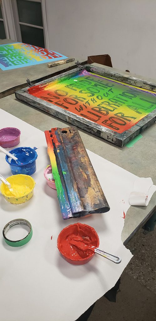 The past year, and especially the months leading up to this year’s Pride festival, was quite tumultuous in the Edmonton LGBTQ community, especially for us QTPOC. I was fortunate to witness the beautiful way this community came together as local grassroots organizations Shades of Colour and RaricaNow organized a march at the end of June to commemorate the 50th Anniversary of the Stonewall riot, against all odds and facing opposition from the very community that should’ve supported them. I was also fortunate enough to make my first print with a “rainbow roll” while making signs for this event. I have been bewitched by how effortlessly such strong and distinct colours melt into each other, making the whole stronger and coming out as the beautiful and timeless rainbow. I feel like there’s a metaphor in there somewhere.