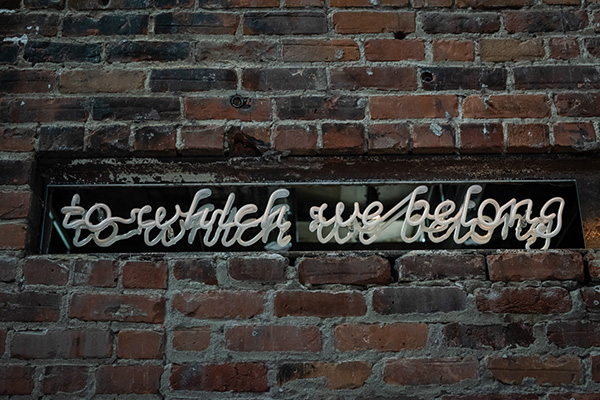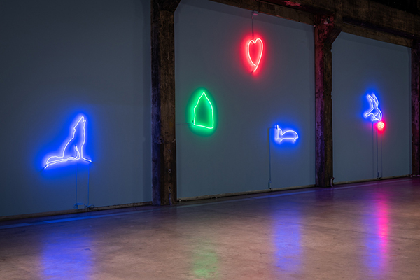 The alcove where the body rests in Day and Night is formally echoed in the space that Niche occupies at the far end of the gallery. Glass text, an inverted fragment taken from Charles Moore, reads, “to which we belong & which belongs to us.” The beautiful, itinerant body read alongside Moore’s inverted text implies belonging as an act of adaptability – one that might be spatial, but not necessarily dependent on space. The psyche of belonging is further excavated in Diving for Dreams’ five neon drawings: a howling wolf, heart, bed, house, and bird in mid-flight derived from an “open-ended collection of drawings” produced in response to the word “home.” In Daring Others Steinman recasts an image of the Foundry’s exterior as a postcard with minor edits so that “Darling Brothers” now reads as “Daring Others.” Here the image of the Foundry is dispersed with its public, its past branding merged with the present “here to stay” slogan.