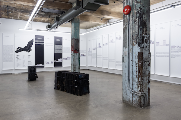 Occupying two rooms at Fonderie Darling, the exhibition first opens into a brightly lit space where artworks reside surrounded by several black and white panels hanging from the walls. Serving as a timeline of the summer months of 1991, the panels demarcate notable events from cultural celebrations to racially charged attacks. Four black panels each represent a Black man killed by the Montreal police.