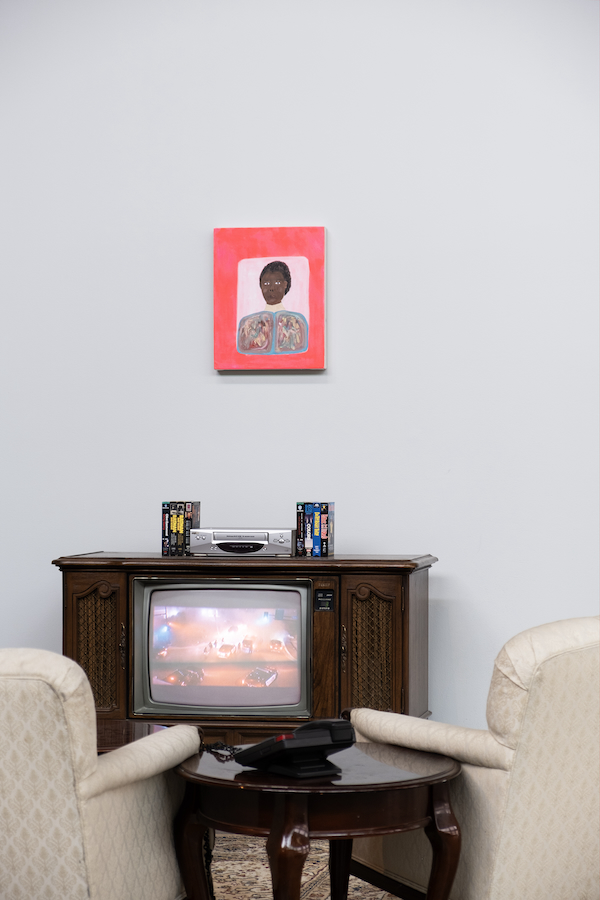 The works occupying the second room largely possess archival qualities. In the center, an old Volkswagen taxicab sits, playing hits from the 1990s, with an iconic beaded seat cover on the driver’s cushion. Adjacent is an installation of a living room with couches and an end table facing a vintage cabinet television. Footage lifted from old broadcasts about racism and police brutality plays on loop. These pieces call back to Joseph’s own personal history and memories, as well as the broader cultural context. Cab driving, a frequent career choice for Afro-Caribbean immigrants including Joseph’s father, was also a site of racially charged discrimination. There is something immediately familiar about this exhibition that adds to the very Black feeling Black Summer ’91 evokes. Despite not being alive at the time, I feel my connection to the works and the era deepened by the comforting resemblance to my own specifically Afro-Caribbean experiences.