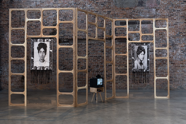 Michaëlle Sergile’s Lè m sot Ayiti pays homage to Black women and the work immigrant Black women do to construct lives in new countries. Wood structures reminiscent of retro room dividers or scaffolding are built around two woven portraits of silent but confident women. They depict the first two women in Sergile’s family to come to Canada.