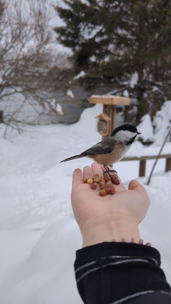 I had my husband build me a platform bird feeder that I can see out my kitchen window. Spring is an especially exciting season, as many migrating birds pass through my area – some appearing only once a year for a short time. One of my highest accomplishments is being able to feed the chickadees in my backyard out of my hand.