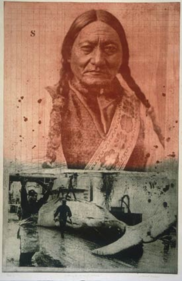 Carl Beam, Sitting Bull and Whale (from the Columbus Suite), 1990, etching on Arches paper.