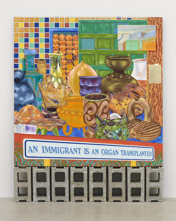 Chukwudubem Ukaigwe, The Story repeats itself syncretized and Variegated, 2025, oil on canvas, eight cinderblock bricks (photo: Rachel Topham Photography)