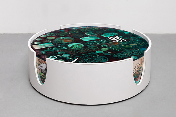 Common Place: Common-Place, curated by Lillian O’Brien Davis, is an excellent demonstration of what good curation should accomplish: creating a whole greater than the sum of its parts. Catherine Telford Keogh’s circular slabs of stuff are the introductory and central gesture to this end as they present the same argument in microcosm. These dense assemblages (check out the list of materials in the example included above) are composed of seemingly random stuff (soap, straws, pickles, Chicklets) that mean little on their own, but when they’re encased in green Plexiglass and set within giant ashtrays, the refuse inevitably accrues an implication of meaning. And so the investigation, interpretation, and contemplation begin. Set up against similarly heterogeneous works – Patrick Cruz’s wall-painted intervention, Sojourner Truth Parson’s pink stucco and canvas cut-out paintings, and Walter Scott’s silicone and concrete-based stick figures – an energizing conversation begins about the ways in which we cobble together meaning from the stuff at hand. Erika DeFreitas’ disconnected dance on video with an unforgiving chair is the odd one out in this otherwise convivial collection. While the references to Édouard Glissant in the exhibition text provide a contextual garnish, there is enough going in the gallery for a hearty meal.