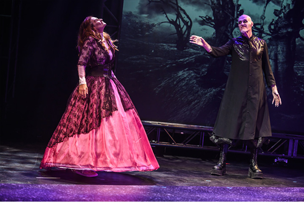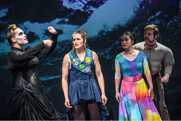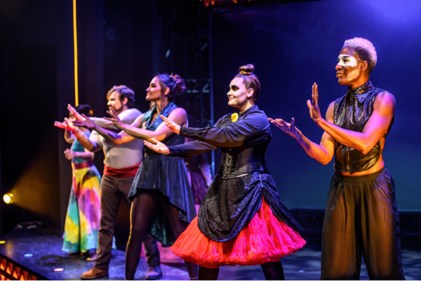 The Black Drum, a joint Soulpepper and Deaf Culture Centre production, is a historical moment for Deaf theatre in Canada. Written by Adam Pottle and directed by Mira Zuckermann (Teater Manu), this play tells the story of Joan (Dawn Jani Birley), a performing artist grieving the sudden loss of her wife Karen (Agata Wisny), who is plunged into a dark world controlled by the Minister (Bob Hiltermann). Her tattoos – a butterfly (Yan Liu) to represent beauty and a bulldog (Daniel Durant) to represent strength – mysteriously come to life in this strange land with no music, no laughter, and no happiness. Joan and a cast of characters including the dance teacher Ava (Corinna Den Dekker) and her young charges (Jaelyn Russell-Lillie, Sita Weereratne, and Abbey Jackson-Bell) must work together to undo the oppression of the Minister and his henchwoman Squib (Natasha Bacchus), and free Karen from his control.