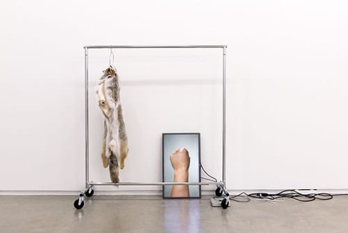 Duane Linklater, The place I seek to go, 2014, coyote fur, garment rack, flatscreen TV, Mac mini, HD video loop and cables