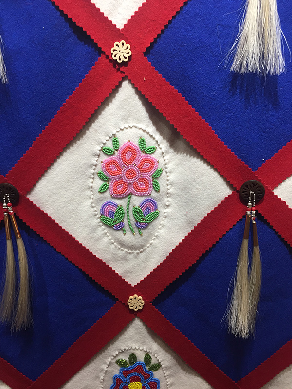 Brittany Cherweniuk’s Quilt explores connectedness through kinship as well as traditional Métis craft. The quilt is made from moccasin vamps gathered by three generations of women gifted to the them by friends, family members, and even strangers. The vamps were then incorporated into the quilt design accompanied by tassels of horse hair. Elegant and tactile, the piece stands for the women of the Métis nation individually and collectively. In her artist statement Cherweniuk explains: “We invite you to look at each flower and recognize her as the women in your lives.”