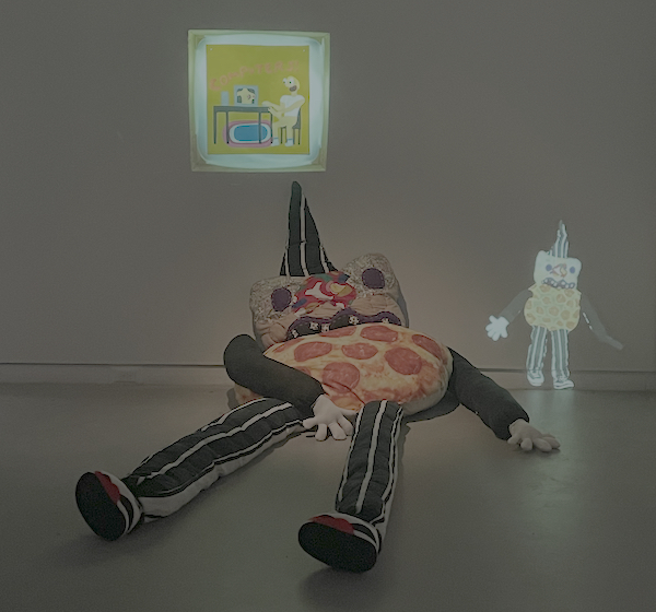 Hannah Epstein’s exhibition Plato’s Goon Cave, currently on display at Mount Saint Vincent University Art Gallery, hyperbolizes the goon cave to fantastical ends, meditating on this site and its implications for the current media landscape. The artist swaps the banal domestic features of a goon cave – ergonomic office chair, LED strip lights, anime bobbleheads, lotion – for an impish reimagining to suit her satiric take on digitized life. As I made my way through MSVU’s hallways and entered the gallery, a stimulated delight washed over me, the kind induced by the neon glimmer of a traveling carnival. Around me was a stunted version of Plato’s allegory: here, Epstein’s goons – largescale anthropomorphic plush characters made from various textiles – remain in the depths of the darkened gallery, purposefully bound to their digitally-mediated simulation.