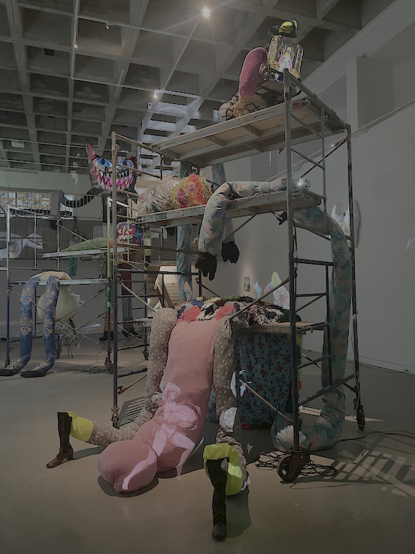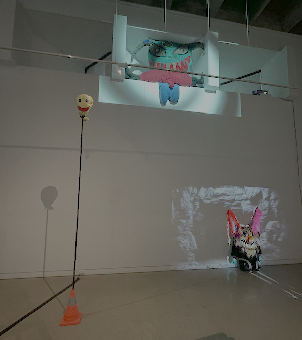 The sheer mass of art Epstein has created for her exhibition engulfs you. Sculptures straddle scaffolding towers, peer from window ledges, and grin from underneath stairwells. The goons are illuminated by the glow of projections to create illusory environments around or doppelgangers on top of the work. The latter simulacra stuffies engage in a range of the kind of eerily alluring devilment we’ve become accustomed to seeing from AI-generated content. One creature, made from stuffed animals vacuum wrapped in plastic bags to make limbs, sat slumped on the floor as an animated twin cowered over it, ravaging its soft innards on a loop. Perpendicular to this corporeal mutilation, a navy, multilegged octopus directed my gaze down a transfixing, spider-spun tunnel. The projections grab and hold your attention almost unwillingly while simultaneously obscuring the physical works by simply being more luminous. The dark lighting required for projection adds to this obfuscation, which reads as a defeated admission to the enthralling effects of screens in a room full of objects.
