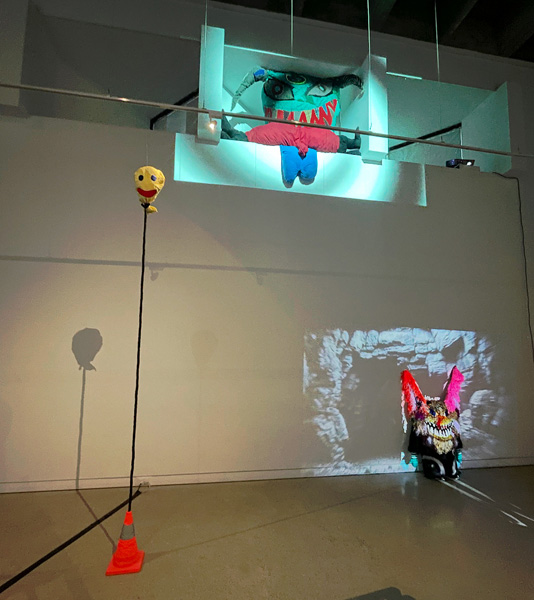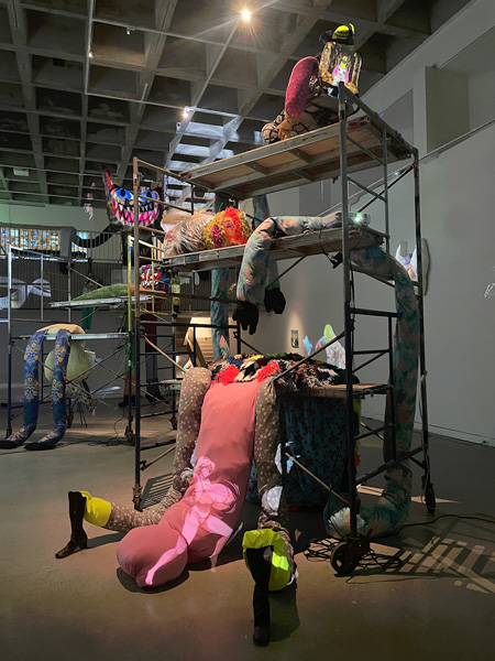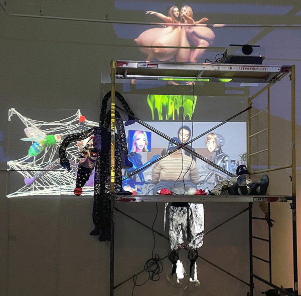 The sheer mass of art Epstein has created for her exhibition engulfs you. Sculptures straddle scaffolding towers, peer from window ledges, and grin from underneath stairwells. The goons are illuminated by the glow of projections to create illusory environments around or doppelgangers on top of the work. The latter simulacra stuffies engage in a range of the kind of eerily alluring devilment we’ve become accustomed to seeing from AI-generated content. One creature, made from stuffed animals vacuum wrapped in plastic bags to make limbs, sat slumped on the floor as an animated twin cowered over it, ravaging its soft innards on a loop. Perpendicular to this corporeal mutilation, a navy, multilegged octopus directed my gaze down a transfixing, spider-spun tunnel. The projections grab and hold your attention almost unwillingly while simultaneously obscuring the physical works by simply being more luminous. The dark lighting required for projection adds to this obfuscation, which reads as a defeated admission to the enthralling effects of screens in a room full of objects.