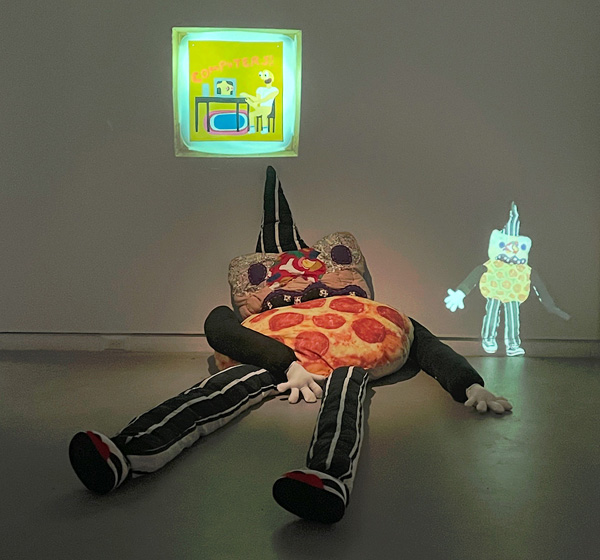 Hannah Epstein’s exhibition Plato’s Goon Cave, currently on display at Mount Saint Vincent University Art Gallery, hyperbolizes the goon cave to fantastical ends, meditating on this site and its implications for the current media landscape. The artist swaps the banal domestic features of a goon cave – ergonomic office chair, LED strip lights, anime bobbleheads, lotion – for an impish reimagining to suit her satiric take on digitized life. As I made my way through MSVU’s hallways and entered the gallery, a stimulated delight washed over me, the kind induced by the neon glimmer of a traveling carnival. Around me was a stunted version of Plato’s allegory: here, Epstein’s goons – largescale anthropomorphic plush characters made from various textiles – remain in the depths of the darkened gallery, purposefully bound to their digitally-mediated simulation.