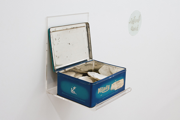 Two small heart-shaped mirrors inscribed in Arabic anchor Jamelie Hassan’s installation, signaling the beginning and end of a journey. Eight similarly inscribed glass discs (mirrored text on matte white), a confectionery tin, a small hand-painted ceramic tile of a railroad track in the snow, an old photograph of three men in white around a marble counter, and a textured white “snowball” sculpture stretch across the expanse of a long wall. These objects mark out the journey of Hussein Shousher, the artist’s grandfather, who traveled from Kar’oun, Lebanon in 1901, to Ellis Island, New York in 1902 (where he was given the name Sam Hallick), then onward through Canada and the USA. Settling in Sioux Falls, South Dakota, Shousher opened The Snowball Cafe, an ice cream parlor, in 1917 (featured in the photograph). The tin is filled with ceramic multiples embossed with hand shapes, each with an eye inside its palm (the symbol of the Eye of Fatima, believed to protect against the evil eye). Produced by Hassan and given to gallery visitors as a keepsake, the ceramic multiples combine an Arabic amulet for protection with the artist’s memories of making hand-prints in the snow as a child. While each object symbolically maps out a journey of displacement, loss, and community across vast distances, immense weight is felt in the empty space between each marker, evoking gaps in memory, or the gaps between personal and dominant cultural histories.