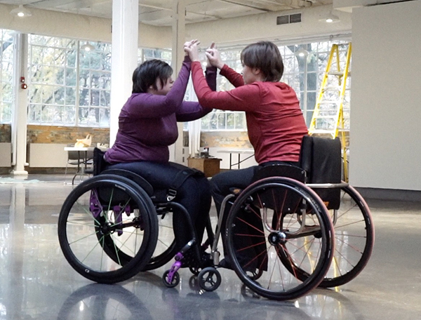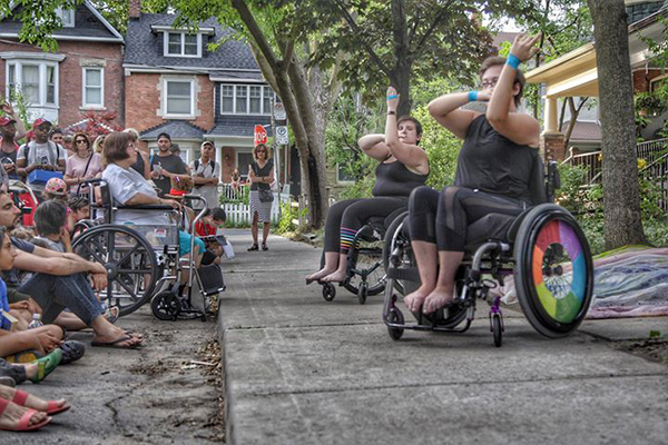 Working as a wheelchair dancer in Toronto, I would say there is little infrastructure to support disability leadership in the city’s dance community. Many of our prominent dance venues, including the Toronto Dance Theatre and Dovercourt House, are completely inaccessible. As dancers, we (Cyborg Circus Project co-founder Jenna Roy and I) are for the most part cut off from the structures that would help us develop technique and skill, and would typically mentor us through to teaching opportunities as our careers progress. Furthermore, this structural exclusion from the dance community in Ontario, and many parts of Canada, has resulted in generations of dance teachers and professionals who have never had to contend with teaching disabled dancers or fostering disabled leadership. Even when classes are held in accessible locations, teachers frequently require basic instruction in how to adapt their teaching approach to our bodies and capabilities, and limit our dance potential due to a lack of imagination about the potential for exploration that disabled bodies provide. We often find ourselves in the dual position of teacher-learner where we must first instruct our instructors before we can receive even a minimum of adequate instruction.