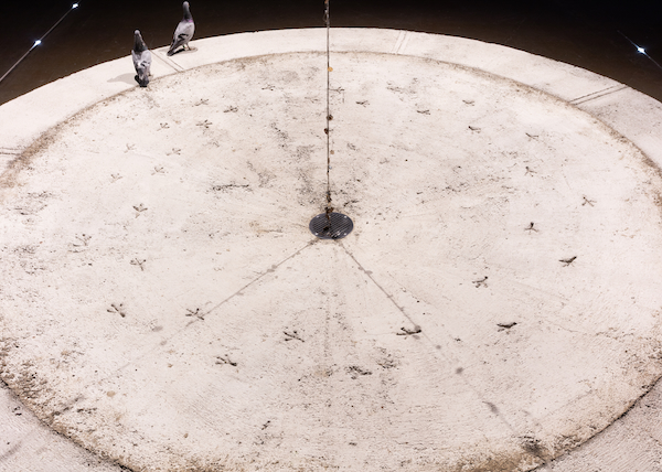 Reading the word “harbinger” (the name of Jenine Marsh’s solo exhibition currently on display at Kitchener-Waterloo Art Gallery), my first thought is of the wizened stranger in a horror film whose role is to warn travelers of dangers ahead (inevitably, doom-filled ends). A harbinger, according to various dictionaries, is what (or who) “foreshadows or foretells the coming of someone or something”, such as the appearance of a ghost as a sign from the beyond, or spring growth as proof of warmer weather to come. In exhibition notes provided by the artist, the word “harbinger” (“a scout”, “an omen”) starts to take on more shape. Its interlocutors in/through coins, pigeons, windchimes, LED lights (“fairy lights”), and their pathways and imprints forewarn perhaps – but in language more grounded in fiction (speculatively and materially) than direct ties to the world outside.