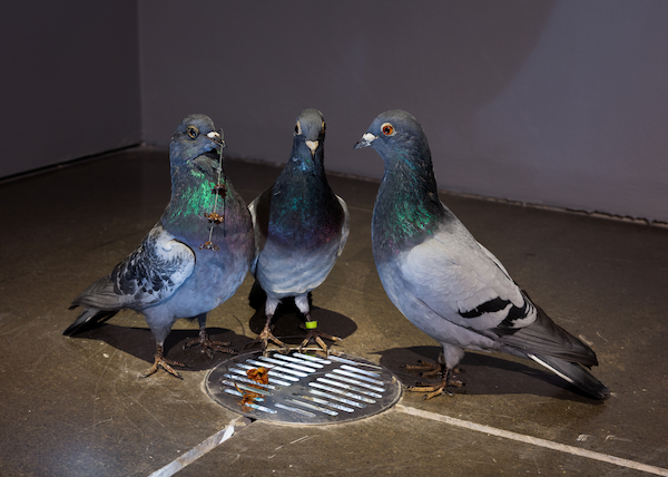 In the furthest left corner of the gallery, three more taxidermy pigeons converge around a floor grate, their shadows casting large silhouettes. One pigeon holds the stem of a rubber-encased flower in a picturesque pose. Pigeons, Marsh reminds us, have become synonymous with public city life but are treated like pests or ignored. What they offer in contrast to coins or currency, Marsh suggests, cannot be used and consumed (or even comprehended) within the usual capitalist systems of value and exchange, just as what her damaged coins offer, or the wishes that might be made with them.