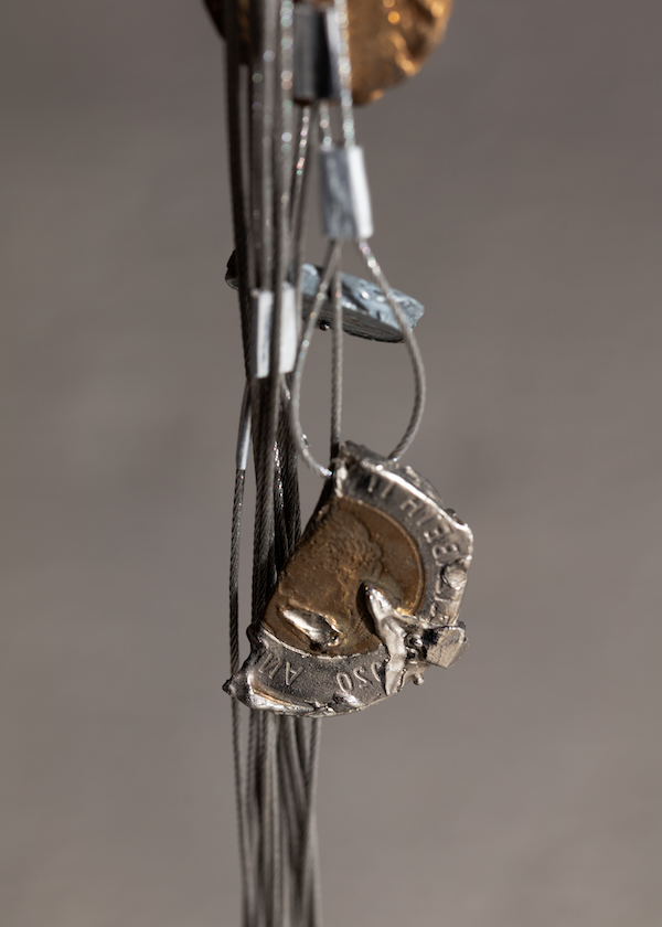 The centrepiece of the installation is a large, flat, white-grey concrete circle, its concave interior suggesting a shallow pool or the classic shape of a public fountain. Dramatic lighting showcases the fountain (or deifies it) in the otherwise darkened space. The exhibition’s wall text speaks of “sacrifice and utopic hope”, tying these ideas to the “near-universal ritual” of making wishes by tossing a coin into a fountain. In Marsh’s reimagined version, the usual signifiers are indeed present but completely transmuted. The “water” that shoots from the fountain’s central grate is a length of taut wire interwoven with wire arcs, like watery-wire “spray”. Affixed to the wire are various discs in coppery pinkish-orange or shades of burnished bronze or silvery grey, occasionally with a greenish-blue patina. The discs are coins in various states of intelligibility; all are flattened, stretched, studded, gouged, or pierced, their coin identities dissolved from a process of defacement. Looking more closely, the taut wire isn’t actually taut, but hung, weighed down, and attached to the grate to create the illusion of “water” flowing both downwards and upwards.
