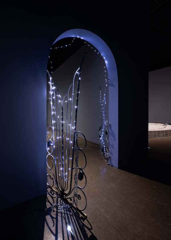 Two steel gates are swung open, allowing entrance through an arched doorway. Delicate white-blue LED lights are woven through the gates’ loops and spires, creating a casual Christmasy/Halloween vibe. The steel design is harp-like, wings expanding with tips sharp or truncated as if cut free from a previous location. Key-pad locks and lengths of chain hang and drag from the gates, suggesting an enthusiastic, DIY security system. A pile of receipts, flyers, newspaper, and a few feathers are piled on the floor, appearing wind-blown and random. The lighting on this threshold is dim, gothic. The gate’s skeletal steel casts dramatic shadows on the grey-blue walls.