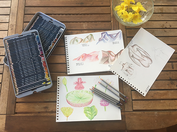 Finally, these days, I have gone back to drawing, painting, and carrying studies through detailed sketches. This is a deeply meditative process. As I go through cycles of creation, which typically end with a lot of outwards energy – producing, exhibiting, performing etc. – I tend to go back inwards in order to reconnect with myself, to listen to the parts of me that I need to grieve so that I can birth new parts of the self. These long hours of drawing and painting are always delightful, privileged moments that allow me to quiet the noise, to go inwards and listen to my own growth through my breath and heartbeat.