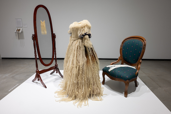 The Golden Section inescapably speaks to the histories of Black hairstyling itself, from the very beginning of colonization until now. Preparing for the horrors of the transatlantic slave trade, Africans would braid seeds and grains of food such as rice, okra, and beans into their hair to bring to the “new” world, with a determined intricacy that The Golden Section shares. This is especially clear in The Bond, displayed in a room towards the back and tucked around a corner. A wooden mirror frame with hair crocheted into mesh instead of a reflective surface faces a Kanekalon braid and loc recreation of Queen Victoria’s wedding dress. Next to them sits an upholstered chair with white gloves upon it. Instead of buttons, the gloves are fastened with kernels of corn, much like those slaves may have woven into their hair. The chair itself doesn’t escape scrutiny either. Knowing that slave owners would also stuff chairs with the soft hair of their slaves, I had to ask what it was upholstered with? To me, it was Schrödinger’s (c)hair.