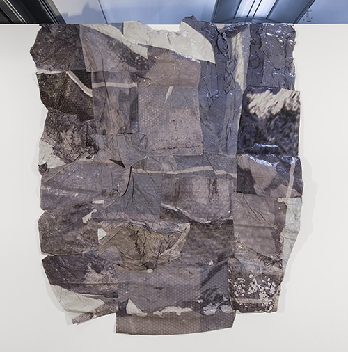 The penciled-in premise of Museum London’s exhibition Lamina Stamina is starting to smear, echoing the inevitable off-gassing associated with the kind of plastic vinyl used throughout artist Kelly Jazvac’s career. In this survey of her work between 2008 and 2018, vinyl is draped, collaged, stitched, and even folded into intricate patterns. Her repurposed plastic now appears strange and weathered. What do we do with the material presence of what remains? The predominant feeling is one of inconvenience and guilt. The gnarled, wrinkled, lumpen shapes echo an exhausted utility and worth. The pieces are big and bulky, slippery and resistant; their material return can’t be ignored so easily.