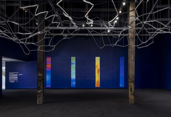 On the surrounding walls are colourful vertical strips or “breath portraits” that translate the exhalation of members of the Black community into abstract designs reminiscent of medical imagery or data displays. They are lit to glow in the murky exhibition space and evoke the final breaths of those who were killed. After the lyricism and fantasy of Floating Sea Palace, this installation is a stark reminder of the facts. Both artists have created elegies, though of contrasting tones. Lam’s speaks predominantly to the heart while Campbell’s speaks first to the mind. Together they imbue the landscape steps away from the gallery’s southern doors with the ghosts of our colonial past and the remaining guilt that still haunts us.