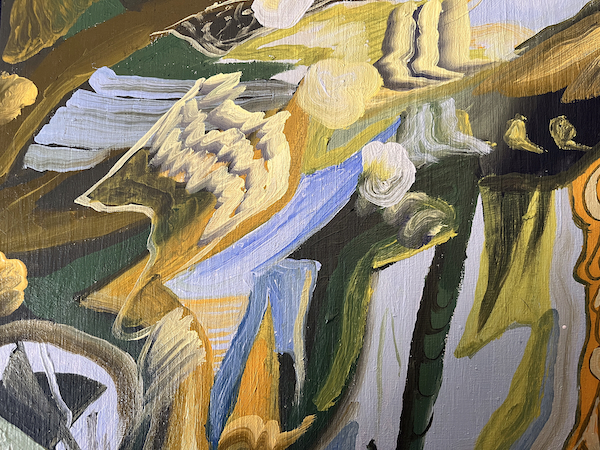 Yellow, black, and blue are my colour fixations right now. I love the greens you can get with various yellows and black. I go through phases with colour where I kind of focus on one palette for a long time and do it to death in some ways. Anyway, I am doing that now with this palette. I was making a green and yellow painting, and I mixed way too much oil, so I decided I was going to try painting with just those colours for a while and it’s been going well.