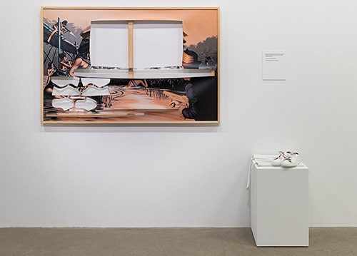 Lam and McCurley carry on their irreverent conversation with art-world authority in Making Something Positive out of Chris Cran’s Painting ‘Self-Portrait with Combat Nymphos of Saigon’ (1985). Once again, their play with signs is pointed. A vinyl print of the Canadian painter with a wooden gun and fedora amid half-naked Vietnamese women in a swampy war zone is cut into bits to make the shoes and tote bag on a nearby plinth. It’s hard to not read a connotation of race in the white spaces left by the cut-outs, and in the squeaky clean prêt-à-porter by-products of what McCurley describes as a hurtful painting that is likely the best-known one in Canada of Vietnamese women.