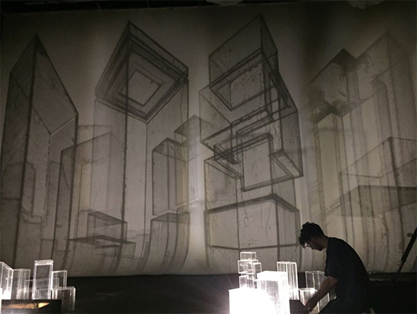I could not forget Biidaaban when viewing Transmissions because both pieces hold similar ideas of Indigenous futurity in hand with precarious Anthropogenic time, and develop these ideas by propelling the viewer to travel. In Transmissions, the three-part installation at the Fei and Milton Wong Experimental Theatre at the SFU School for the Contemporary Arts, viewers are introduced into the exhibit through a long vaulted moving image projection that shifts between a green and lively forest to bustling West Hastings Street in downtown Vancouver. To set aside the environmental juxtaposition, the arched-projection and the narrow canal produces two effects. The first is one of total immersion where spectator experience is placed within the film, so viewers find themselves among the trees and then on the street. On the other hand, I was positioned in an observational role; the transition of the projection between nature and city pointed toward the fact that I was in neither place. Passing under the projections, I became more aware of my position within the life world of the exhibit rather than my passage through the work’s filmic content.