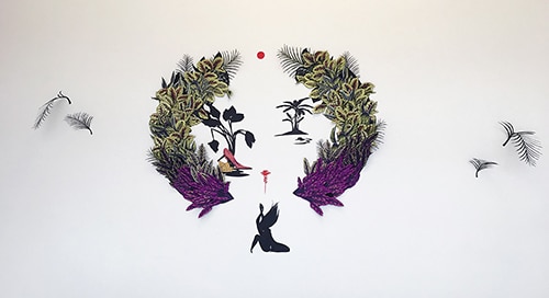 Soft KaurMia Sandhu’s first solo presentation as a recent and welcome addition to The Assembly’s member roster, features the paper assemblages that first caught my attention in past group exhibitions here in Hamilton – fluttering tableaux of strange communal rites beating at the heart of exquisitely contour-cut leaves and fronds, painted with a miniaturist’s care and held in precarious suspension by tiny brass pins.