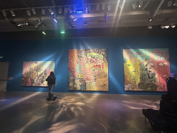 I thought the lighting for the show was awesome. It feels like we are underwater with the fish. Also, the beads she uses in the paintings are stunning. There was one moment when I was looking at one of the fish and it glared back at me because the eyes had some type of mirror-like buttons. Anyways, I am now a huge fan of Pacita Abad and it feels good to be Filipino!