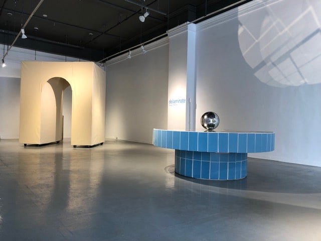Everything is at once familiar and strange in Morgan Melenka’s MFA thesis exhibition delaminate. She has reproduced architectural ornamentation and flourishes such as fountains, arches, and bollards – the kind you find in every mall, airport, and town square – inside the Anna Leonowens Gallery, but here these common, everyday tropes of public architecture are recreated in a way that almost purely deals with surface and illusion. The result is an odd and humorous discordance with the concrete reality of the original forms. An archway on wheels is made of paper, not stone. A low mirrored table with a perfectly reflective chrome ball on its center dominates and mirrors the room, inviting us to reflect on its construction and illusive function. At either end are two large bollards or fence posts made with printed images of concrete on paper. They are curiously soft and unimposing compared to the cold hard originals. As with all the work in this show, these forms are created using improvised construction or printed material to mimic the surface of the originals. Oddly, it is in this cheap imitation that similarities between the original and the fake are strongest.