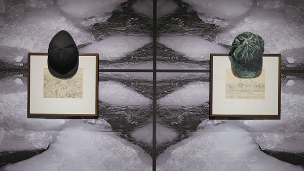 Upon entering the gallery, one’s eyes are drawn to four shiny cast-aluminum sculptures sitting on a wooden platform. This is part of an installation titled Towards Something New and Beautiful + Future Snowmachines in Kinngait. Next to the aluminum casts are 3D prints and aluminum, copper, and linoleum remains from the old Peter Pitseolak High School in Kinngait (Cape Dorset) that burned down in 2015 (it has since been rebuilt). The sculptures and prints depict “snowmachines” adapted from homemade flour-and-water playdough models fashioned by local youth (Christine Adamie, Lachaolasie Akesuk, Moe Kelly, David Pudlat, and Nathan Adla) involved in the Embassy of Imagination program in collaboration with Toronto-based artist duo PA System (Alexa Hatanaka and Patrick Thompson). The aluminum used to cast the dream snowmachines was salvaged from the remains of the burned school and the sale of these sculptures has empowered the group to purchase real snowmobiles.