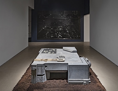 Medicine for a Nightmare culminates in the rear gallery with a tripartite installation comprised of a three thousand pound sculpture titled Formed in the Divine, Divine Form fenced with soil from the Golden Temple (to honour and invite Sikh people who were lost during and beyond Operation Blue Star to witness the work) and placed above a shallow pool of water flecked with delicate white flowers. A vinyl photograph of plates from Hazūr Sāhib is affixed to the adjacent wall and a gong is struck over a seemingly endless ambient drone, reasserting the tranquility, or quiet, with which the exhibition began.