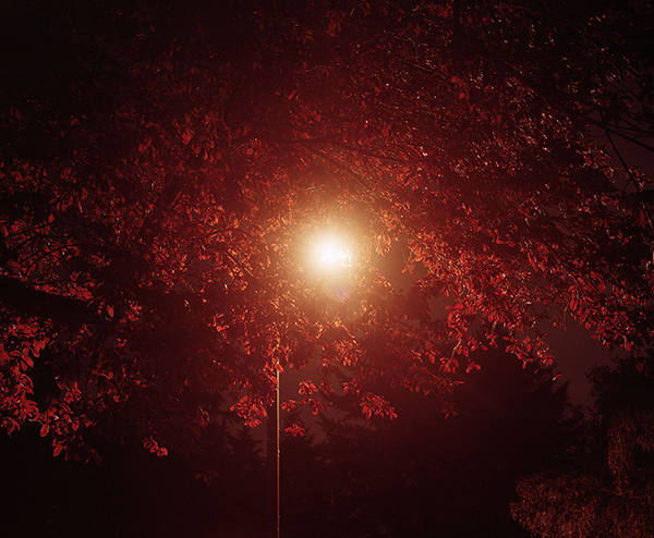 As I walk into Pastoral | Calamity at the Glenbow Museum, I am instantly reminded of the first time I encountered Nicole Kelly Westman’s work. It was in the exhibition Rose, Dear at the Walter Phillips Gallery in Banff. The same unusual orange glow invades the gallery space here – a light that is memory-laced and strange, a light the viewer may not be certain how to place. This light tumbles onto the work cuculoris, a time machine for shadows, while the piece itself drops reflections of shapes and shadows on the floor. Light is filtered through trees and flowers, traced and transferred. The orange hue replicates the light emitted by street lamps – a colouration called sodium vapour. Now within the space of Pastoral | Calamity, the viewer is given a moment to linger beneath the soft glow, to reflect on time lost.