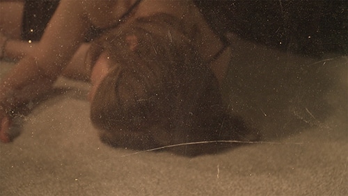 In the black box at the back of the gallery, Anna Hawkins’ video loop Fall Fell Felt shows clipped, stilled, blurred, and re-enacted images from recordings of “girl fails” taken from the internet. Staples of the subgenre are gathered in the work: botched bridge jumps, belly flops in pools, high-heel trips down stairs, trampoline slams, and mishaps with motor vehicles. As we are carried along from one “cinematic moment” of girl failure to the next, Hawkins pauses on the burden of our voyeurism. When the source videos are recorded on the artist’s desktop, we look past the residue of greasy fingers on a screen. When a woman is pushed from a bridge over water, our visual pleasure is withheld as the image is torn in two then recomposed before the splash. We’re denied witness to a bikini-clad woman’s trampoline accident, but catch her lying face-down in a suburban backyard after the fall, and before Hawkins spirits her away with a dissolve. In the video’s transitions the artist replaces parts of her protagonists’ bodies with her own – suspended feet, an extended arm, or folded leg – in effect “breaking both the surface of the image and the falls of her subjects.”