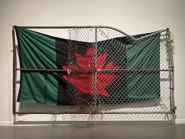 by Faith and Grit occupies the gallery’s central space and is populated by the Nigerian-Canadian artist’s various assemblage sculptures made from “diasporic debris” – a term he uses to describe discarded and unnoticed objects laden with histories from the African diaspora. One wall-hung work combines farming tools joined at the bottom with hockey sticks to create a subtle intervention calling to mind the relationship between sport and agriculture. Two pieces sitting on the floor also reference sport and labour. A baseball glove holding a shell and sitting on a rock looks like it was found as-is on the bottom of the Bedford Basin (where some of this debris was indeed salvaged from). Nearby, a basket woven from tires sits on a cinderblock. It is dedicated to Edith Clayton, a master basket-weaver from Cherry Brook, NS, whose baskets combine traditional African weaving with Mi’kmaq dyes. If you look closely, a small cowrie shell has been woven into the tires, which hints to their importance in Nigerian culture. Two boxing gloves hang from the ceiling on long strands of found bike pedals. They look exhausted, dropped down the way a boxer’s arms might after a knockout, perhaps in a nod to George Dixon, Africville’s own boxing prodigy who became the first black athlete to win a world championship in any sport.