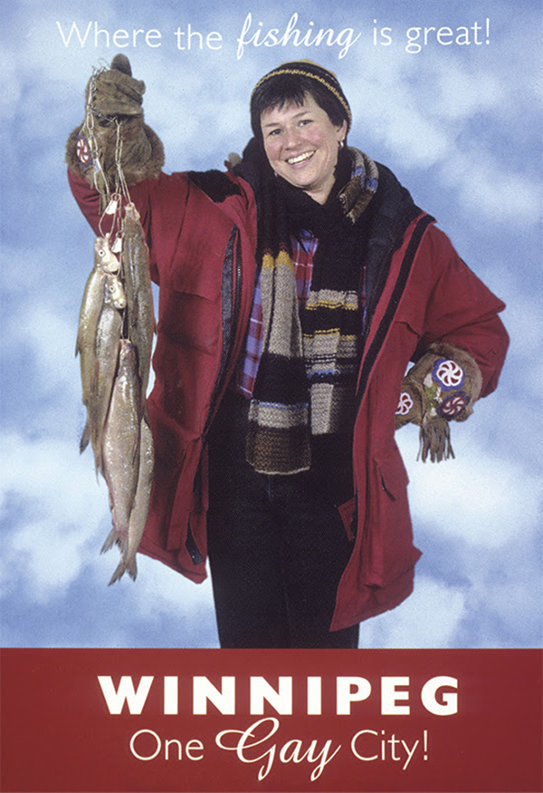 In 1997, Shawna Dempsey and Lorri Millan created a series of photo installations called One Gay City. The project appropriated Winnipeg’s slogan “One Great City” and the artists planned to install their images of “cheerful Winnipeggers” as advertisements in bus shelters throughout the city. Dempsey and Millan were cheekily responding to the Mayor at the time who refused to support Gay Pride Day. Alas, the advertising agency and Canadian Advertising Standards objected to the images’ “gay content” (photos of a happy toddler with a cake, a fisherwoman showing her catch, a boy posing as the Manitoba Legislative Building’s Golden Boy statue) and stopped the installation from happening. The artists filed a provincial Human Rights complaint and produced the photos as a series of postcards instead.