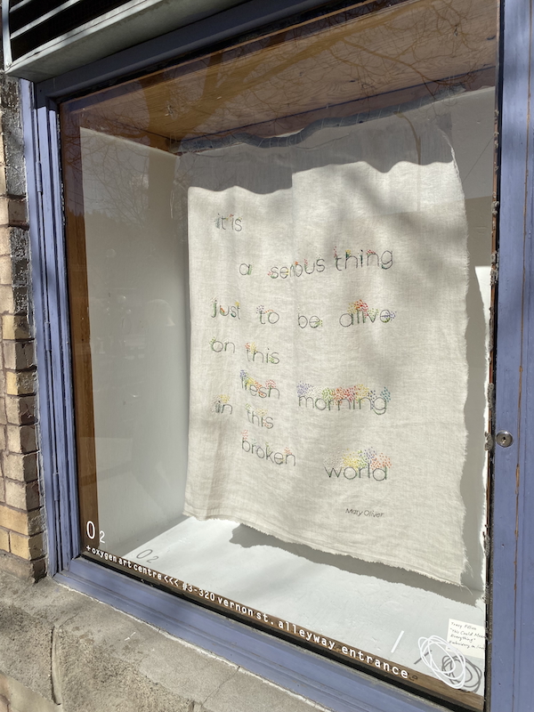 Marcus Dénommé, Why?, 2024, mixed media, in the Oxygen Art Centre’s window exhibition space