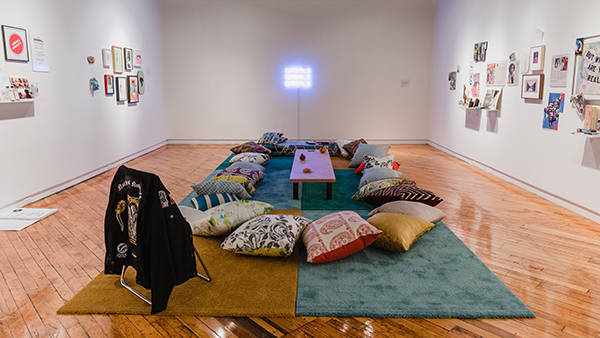 One of These Things is Not Like the Other is a purposefully dense and difficult show to write about. Every inch of A Space’s relatively compact galleries are packed with work – on the walls, on the floor, in corners, and in the middle of the room. On opening night, I twisted my body and shuffled politely as I tried get a closer look at the work and make space for others to get by. I crouched down to read patches embroidered on jackets and squinted to read glossy reproductions of text messages. As I made my way around the exhibition, I occasionally turned towards the centre, trying to consume another stanza or so of the poem etched into a table as part of the baithak (Panjabi/Urdu/Hindi word for lounge).