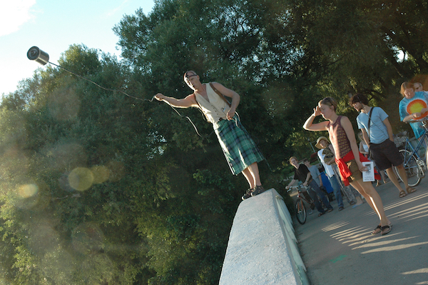 Sound Can Fly for sound can and sound man by Steve Heimbecker and Neil Cadger (Neil Cadger shown in picture) on Toronto Island in 2009 (photo: Stefan Rose)