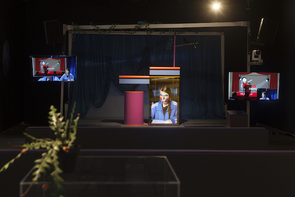 Judy Radul, Live Lecture Streaming Podium: I am Not a Cat, 2024, installation view
