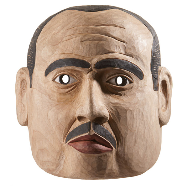 Skeena Reece often adapts the sacred clown or trickster figure within her work. Here the trickster awakens anew in the persona of Marlon Brando. The carved mask of Marlon Brando as The Godfather speaks to traditional Indigenous work while also offering the opportunity to embody the character of Brando and provide a testament to his support of Indigenous peoples.