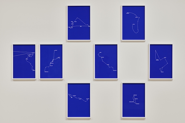 At the gallery’s entrance, Carrie Mae Weems’s The North Star (2022), inspired by her grandfather’s escape from a racist mob in the American South of the Jim Crow era, establishes this fixed point in the night sky as guide, assurance, and companion. This use of celestial observation provides a resonant and necessary political dimension to the exhibition by offering an expansive understanding of witnessing and its conceptualization. Bouchra Khalili’s The Constellation Series (2011) also looks to the past as it traces the journeys of eight immigrants. In Khalili’s work, the places from which her subjects have been displaced and their subsequent journeys are represented on a map that tracks their movements, creating constellations that describe the common migration routes of the region and the intricate commonalities of the migrant experience. The artist holds their stories within these anonymous charts that challenge contemporary migration myths by contrasting them to the documented realities.