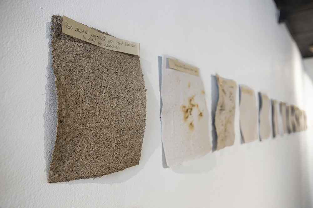 Emerging from time spent in discussion with Elders, Knowledge Holders, and members of the tribal nations of Treaties 6, 7 and 8, as well as members of the Métis Nation of Alberta, Cardinal’s exhibition presents a powerful and incisive view of this land and its histories dating from pre-contact through to the present. To give a gift is the result of several weeks effort shared among community groups sitting in kinship and acknowledgment of the wisdom and grief of generations. A timeline foregrounding an Indigenous history of Alberta materializes across rough sheets of paper shaped by these many hands – as much a result of stories told aloud as of the mixture of water and botanical pulp.